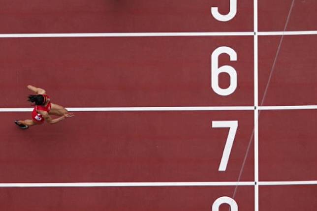 Aksi pelari indonesia, alvin tehupeiory (ketiga kanan) dalam pertandingan prakualifikasi atletik nomor 100 meter olimpiade tokyo di jepang, 30 juli 2021.